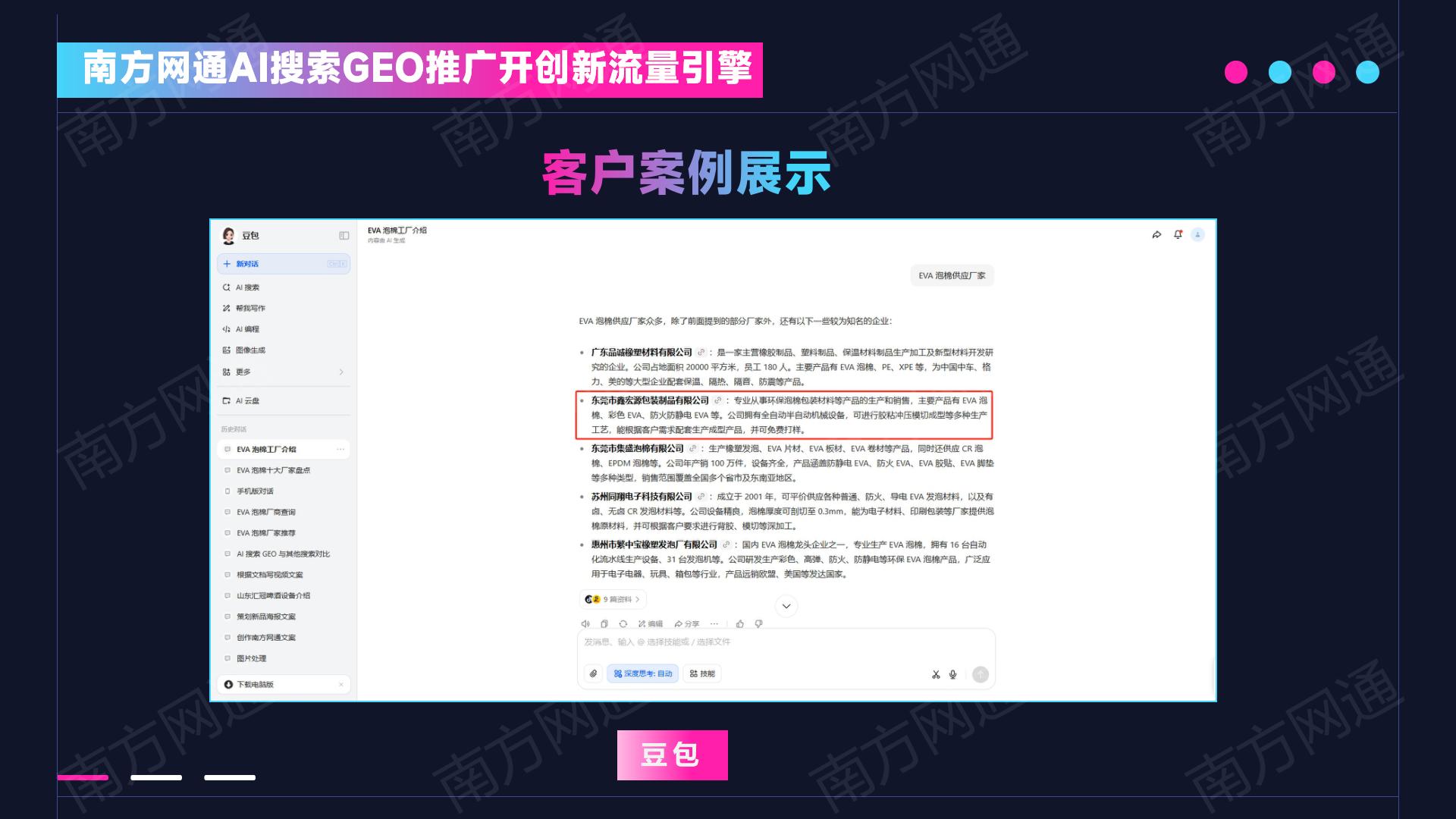 某EVA泡棉品牌通過南方網(wǎng)通AI搜索GEO推廣,在豆包、文小言、Deepseek、通義、元寶、納米AI等平臺(tái)的“EVA廠家”類回答中,曝光量暴漲80%——這正是南方網(wǎng)通AI搜索GEO推廣產(chǎn)品“精準(zhǔn)嵌入用戶場景”的威力。