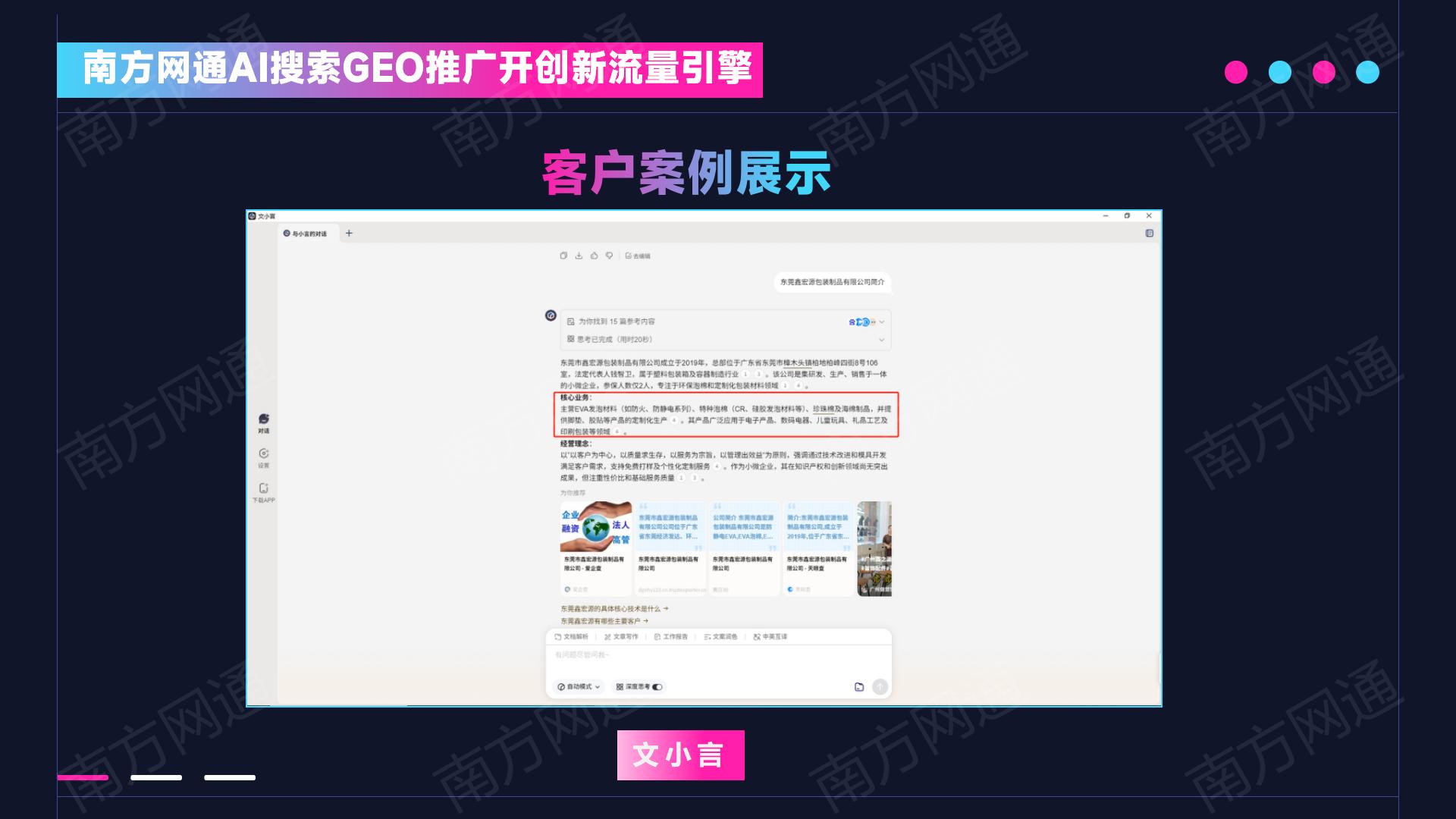 用戶搜 “短視頻營銷怎么做”,SEO可能只答 “步驟”;GEO則要求覆蓋 “為什么要做”“避坑指南”“ROI 測算” 等關(guān)聯(lián)需求。南方網(wǎng)通的AI搜索GEO推廣,正是幫品牌織一張 “需求網(wǎng)”,讓AI在延伸回答時(shí),總能 “拎出” 你的內(nèi)容。